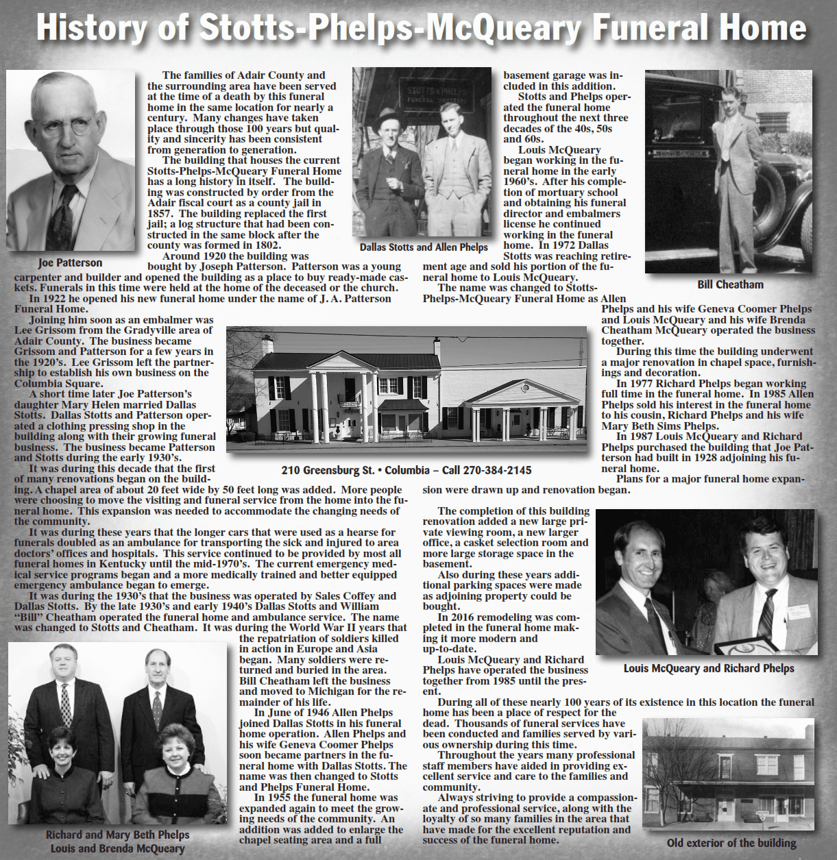 Allen Phelps joined Dallas Stotts in the business in 1945, and the name was changed to Stotts and Phelps. Louis and Brenda McQueary joined the funeral home in 1972, the same year that Mr. Stotts retired. The funeral home was then renamed Stotts-Phelps-McQueary Funeral Home. In 1985, Richard and Mary Beth Phelps joined the firm when Allen Phelps retired.